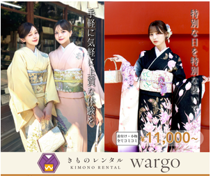 きものレンタルwargoは、京都を中心に東京・大阪・金沢など全国主要エリアに店舗を展開する、きもの・ゆかた専門のレンタルショップです。